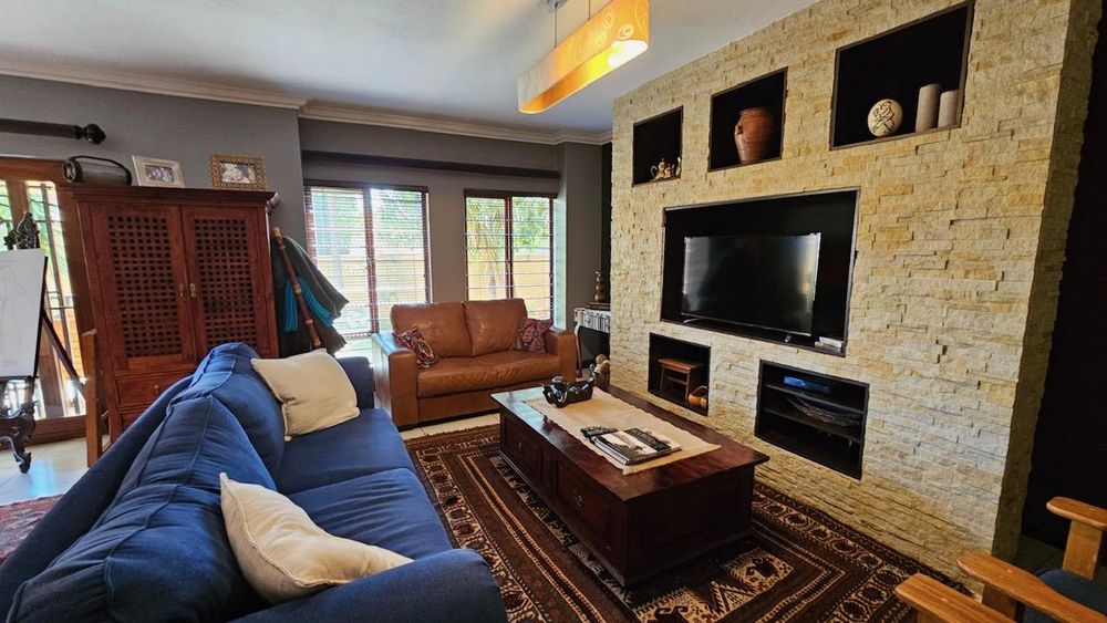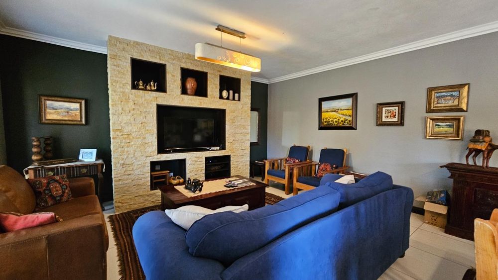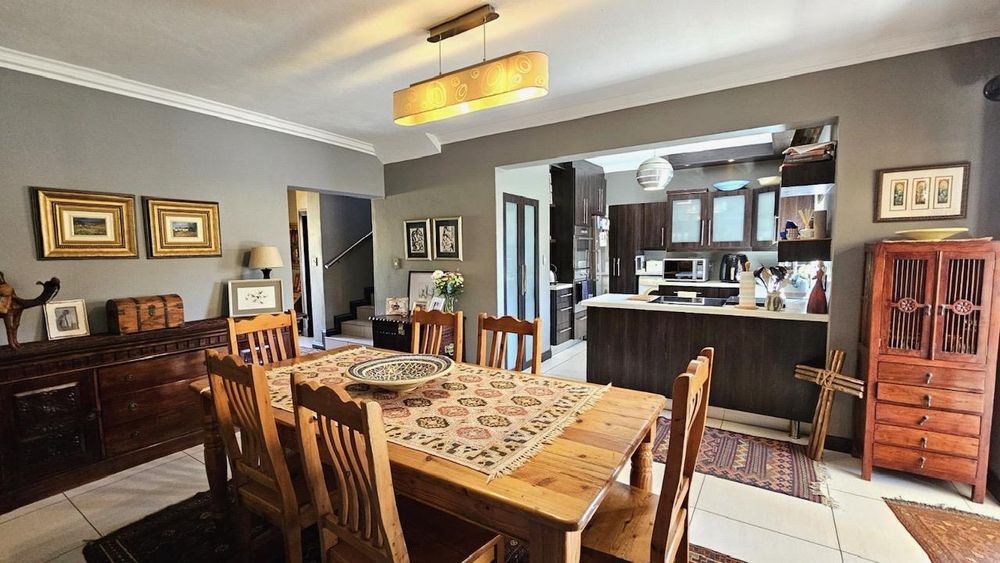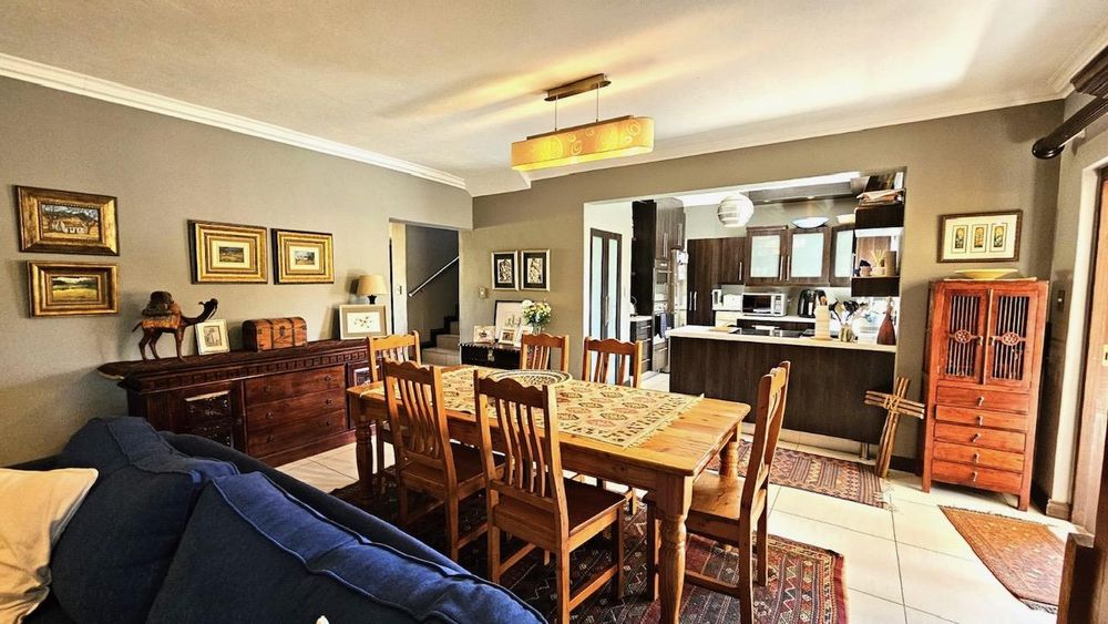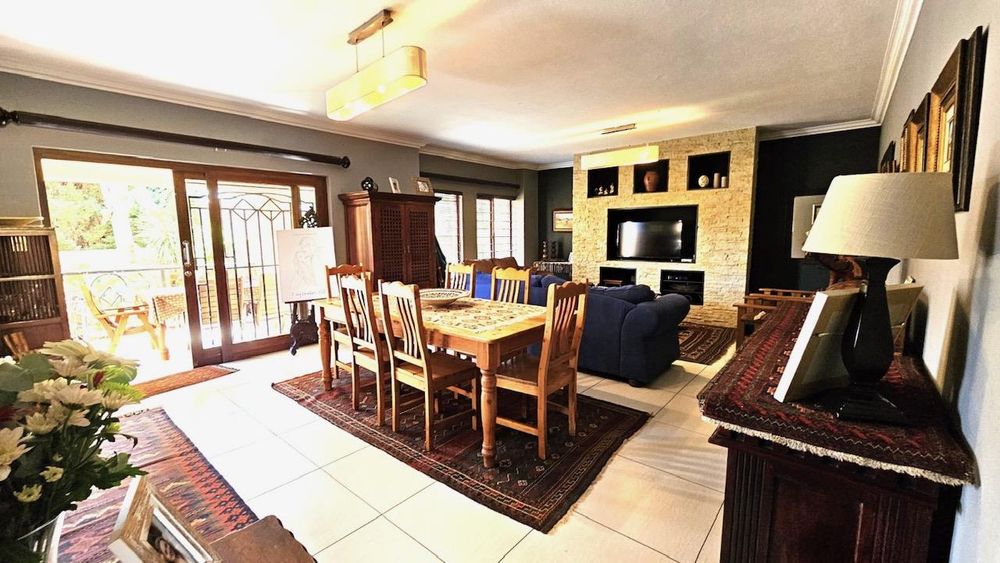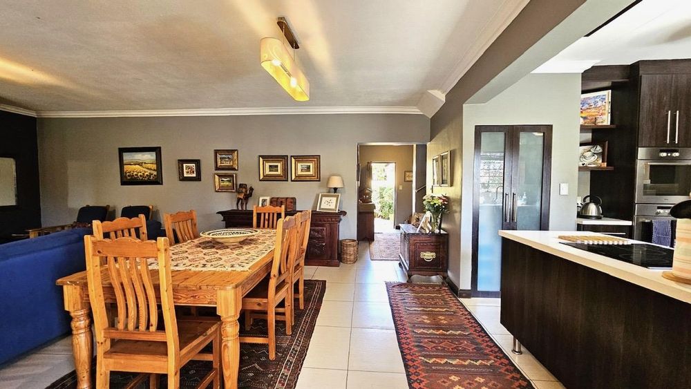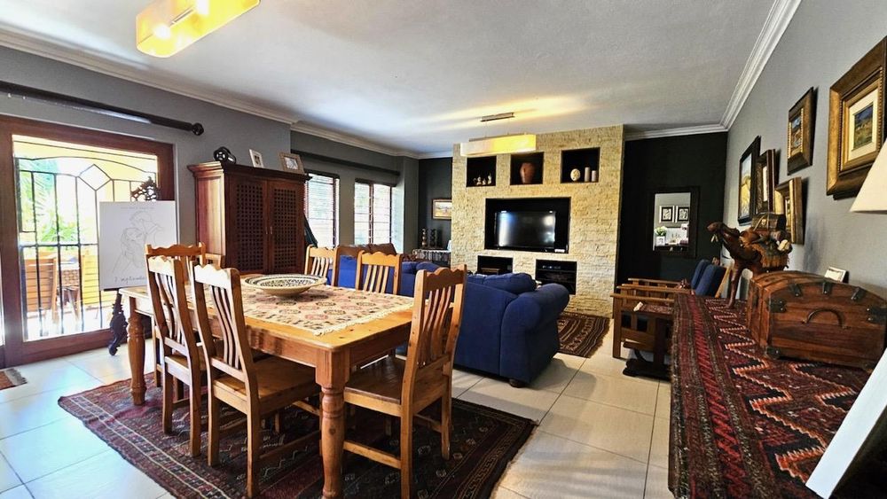 The dining area seamlessly connects to the spacious living area. Wooden sliding doors open to reveal a picturesque back garden, complete with a patio featuring a built-in braai.