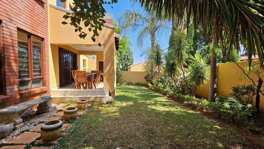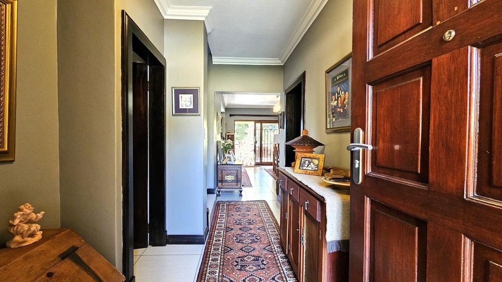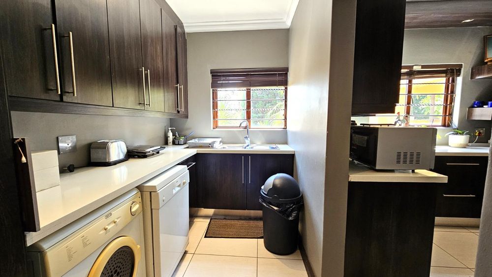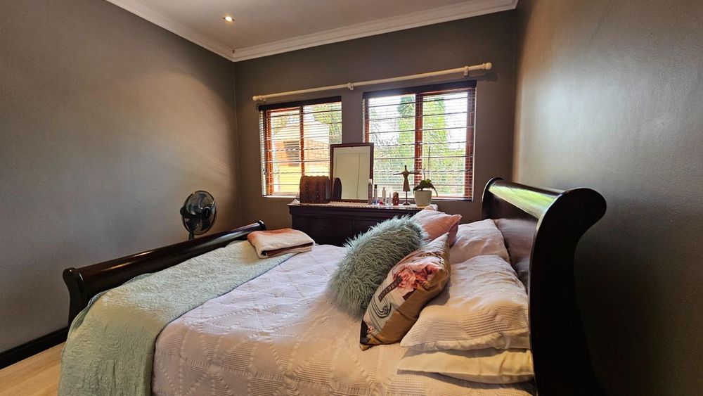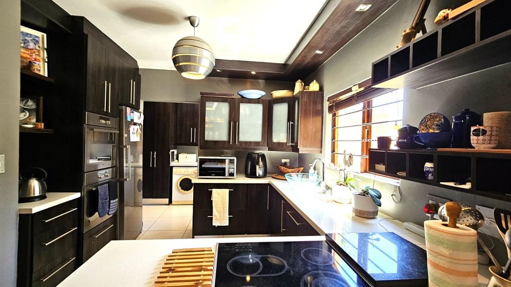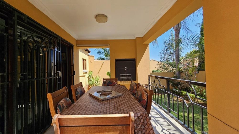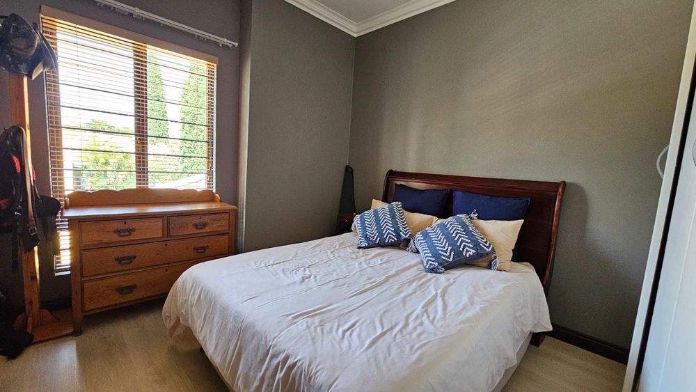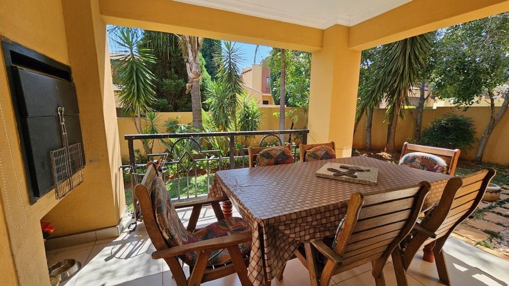 The dining area seamlessly connects to the spacious living area. Wooden sliding doors open to reveal a picturesque back garden, complete with a patio featuring a built-in braai.