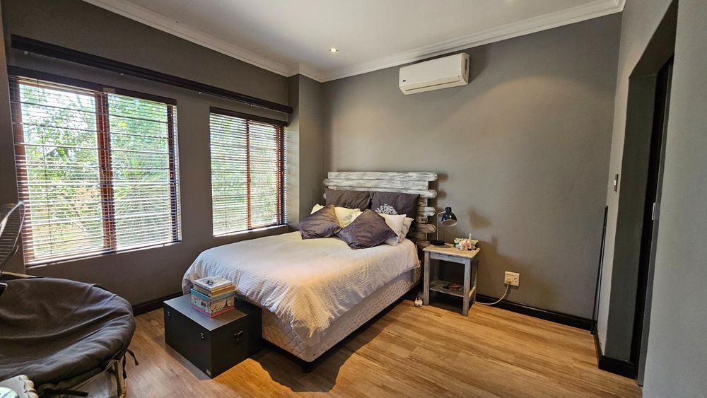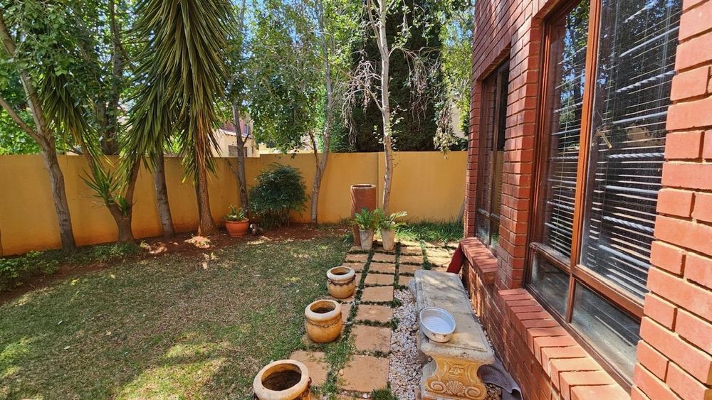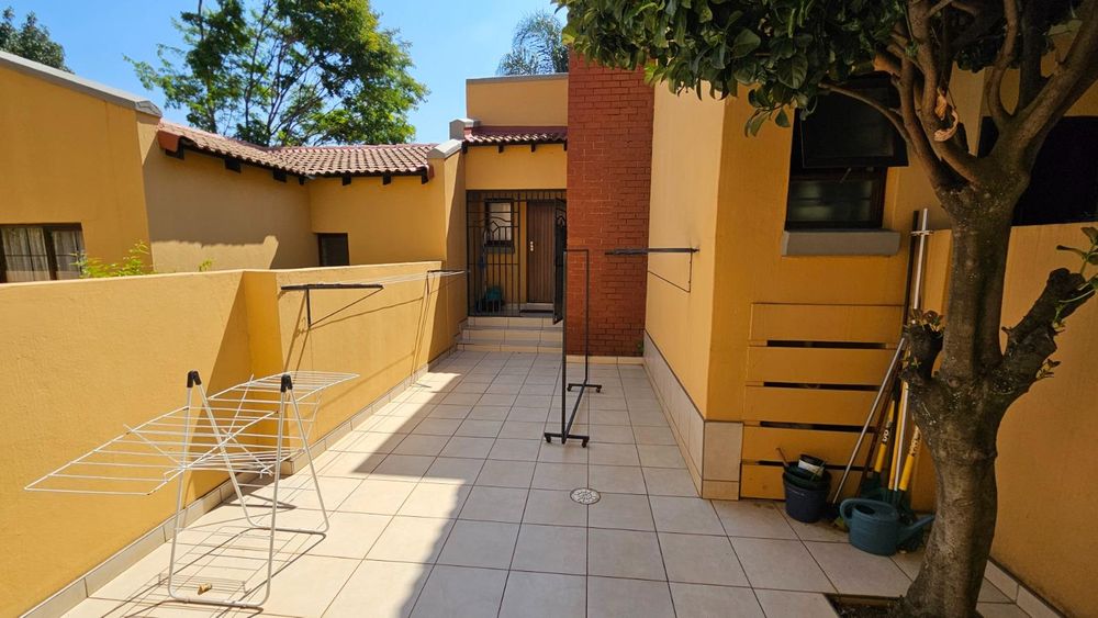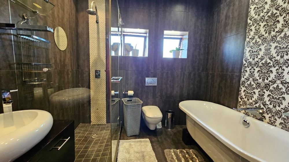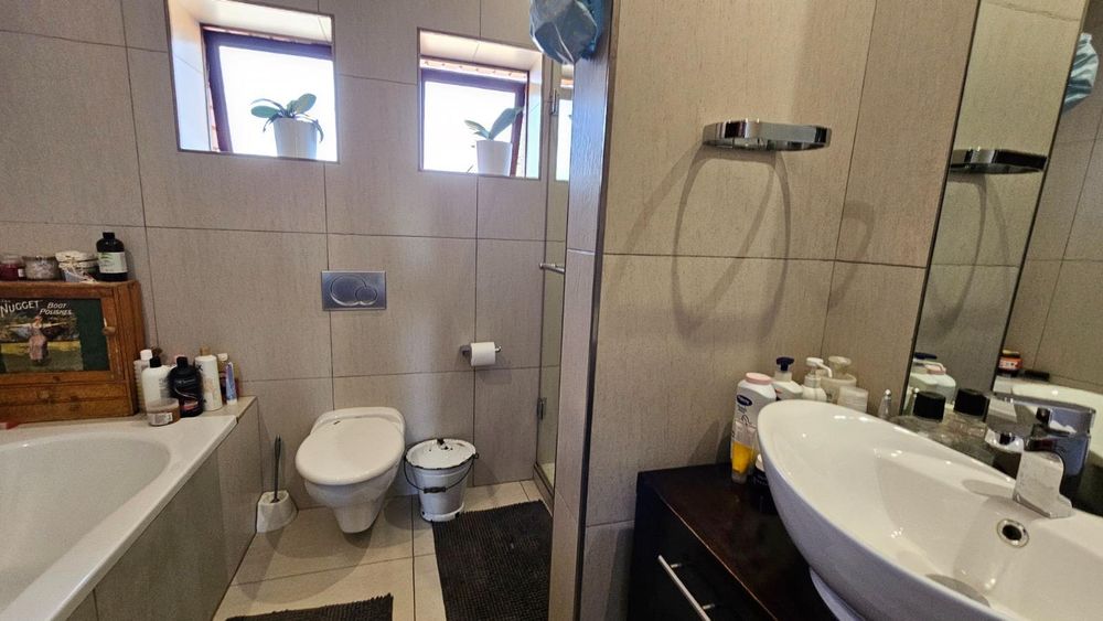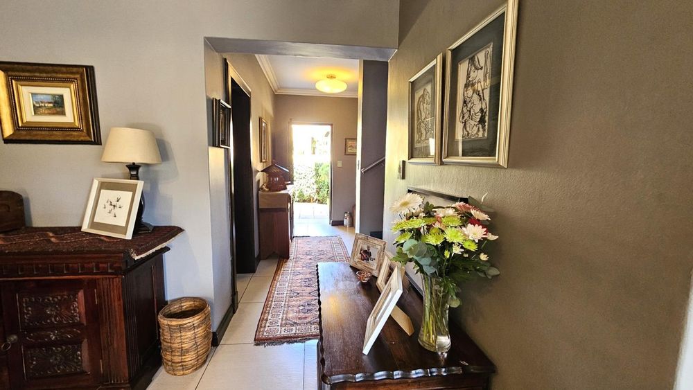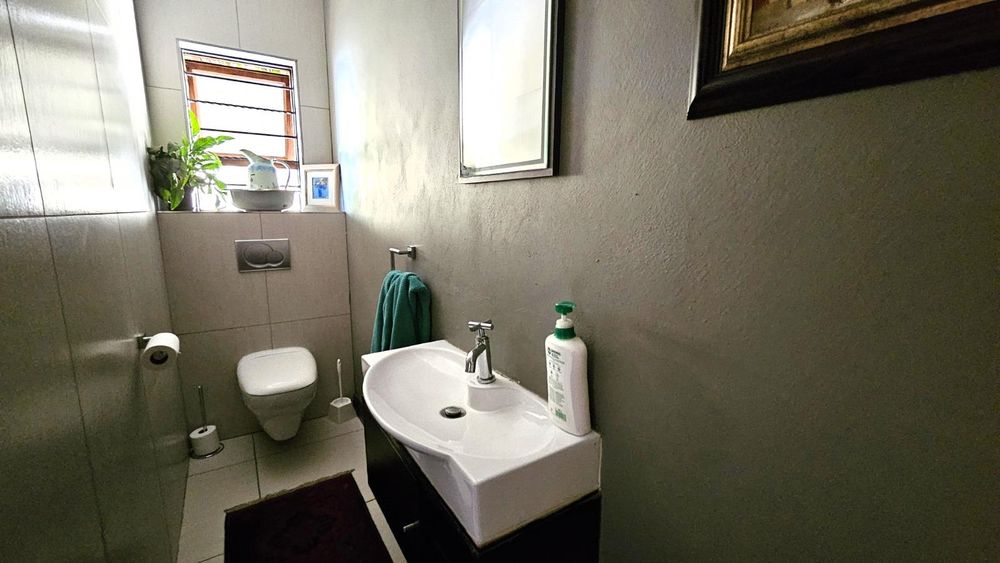 The dining area seamlessly connects to the spacious living area. Wooden sliding doors open to reveal a picturesque back garden, complete with a patio featuring a built-in braai.