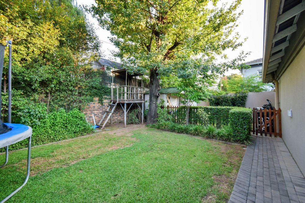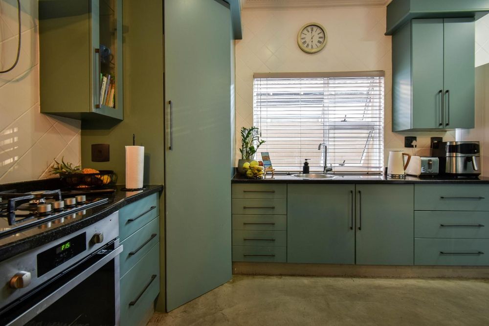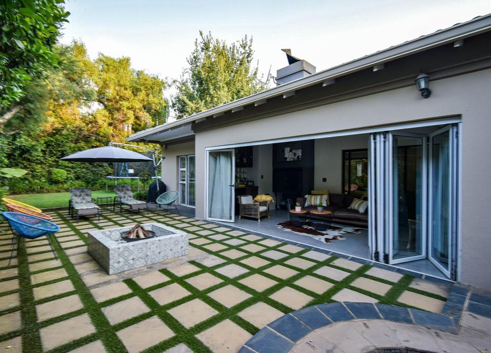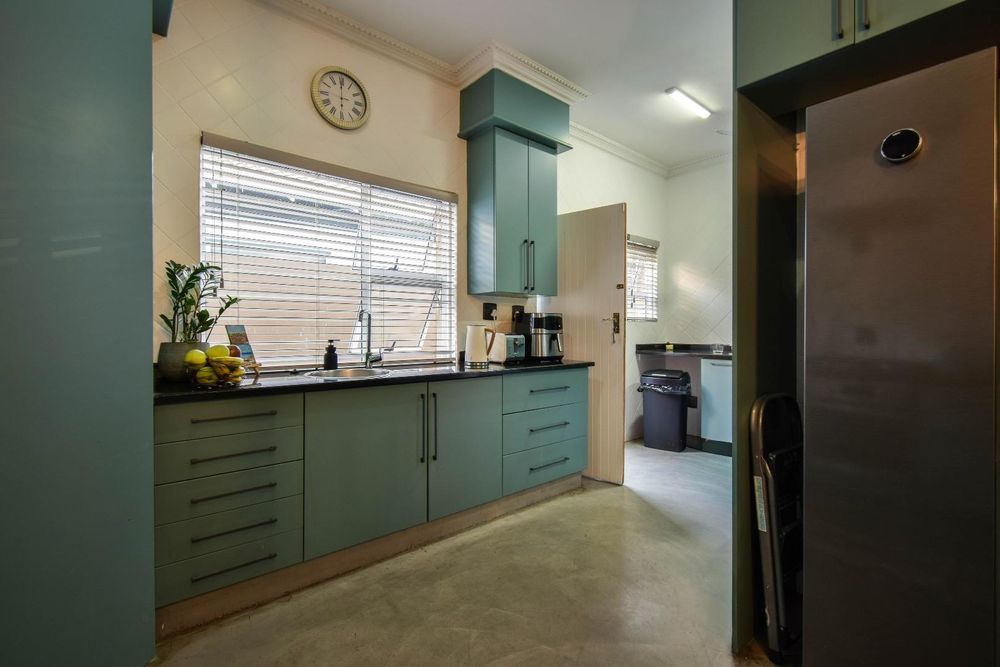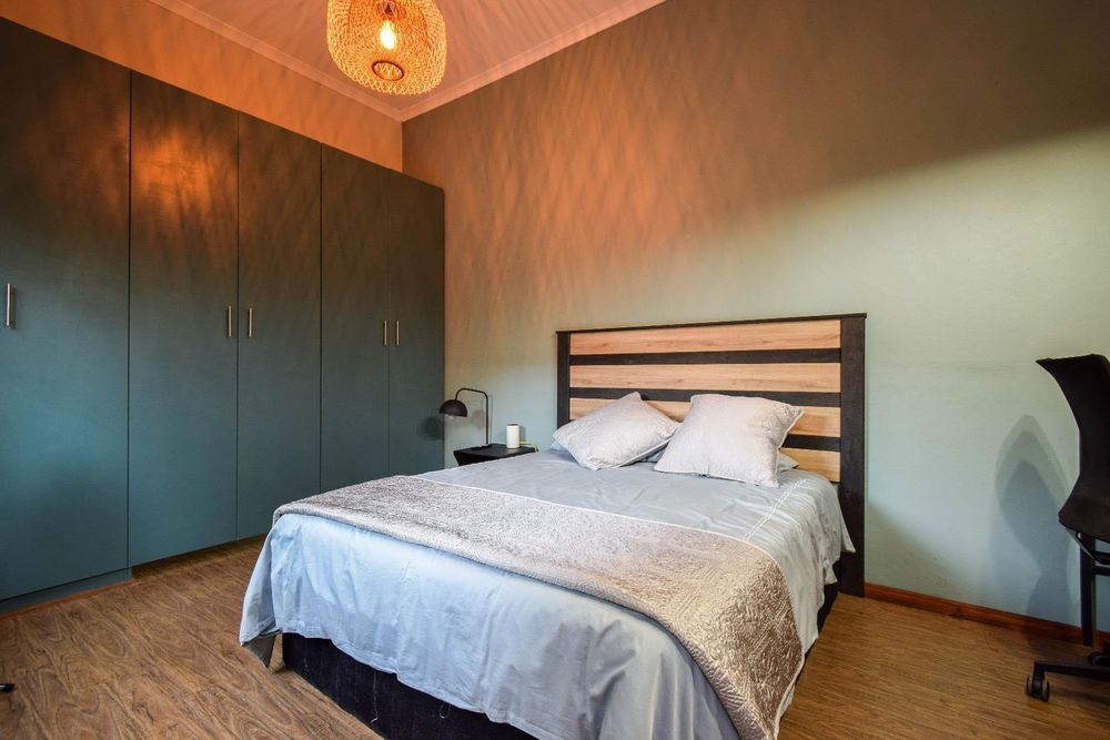 The cozy lounge, complete with a fireplace, invites you to relax and unwind. It opens directly onto a patio that overlooks a beautiful black marble-speckled pool. Adjacent to the pool, you'll find a delightful boma and braai area, perfect for entertaining guests. The outdoor space is completed by a perfectly manicured garden, offering a tranquil retreat.