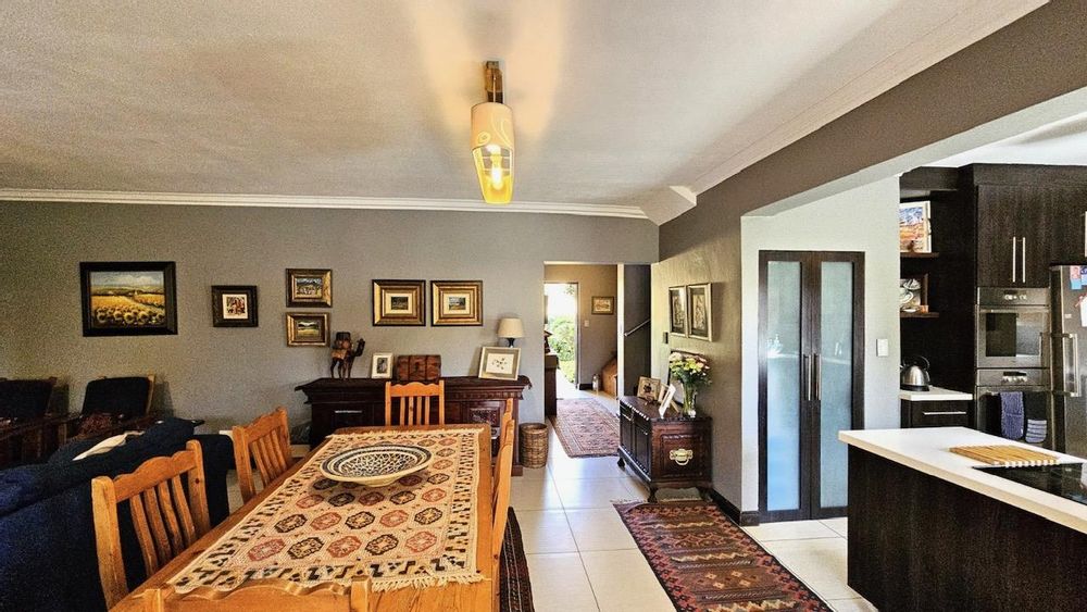 The dining area seamlessly connects to the spacious living area. Wooden sliding doors open to reveal a picturesque back garden, complete with a patio featuring a built-in braai.