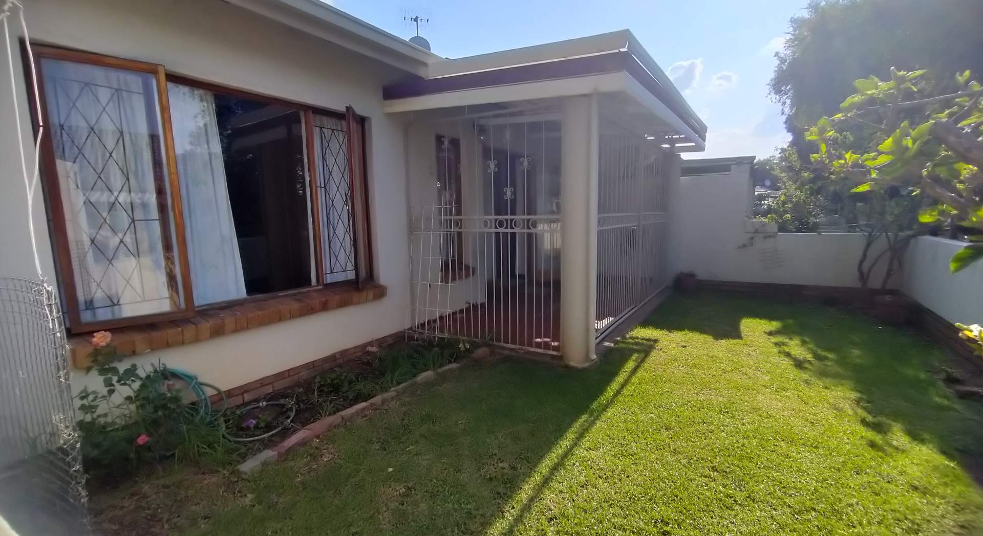Secured covered patio, with garden in front and courtyard at the back.