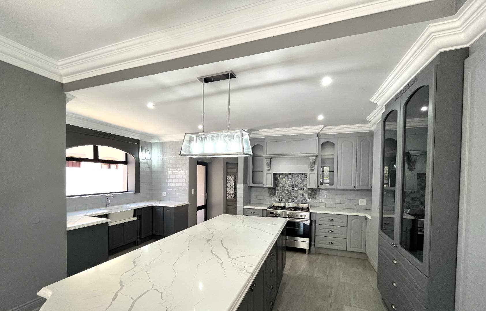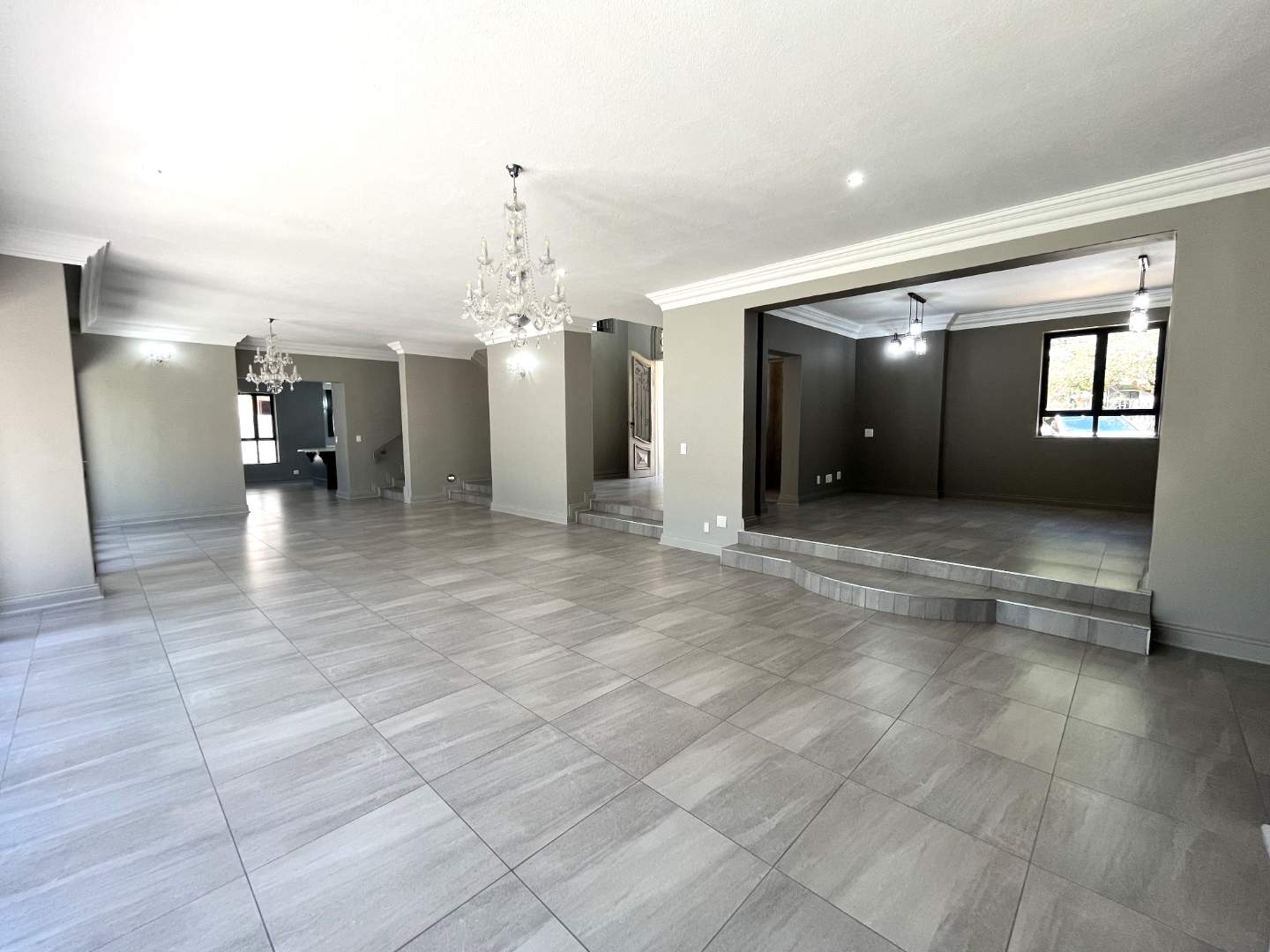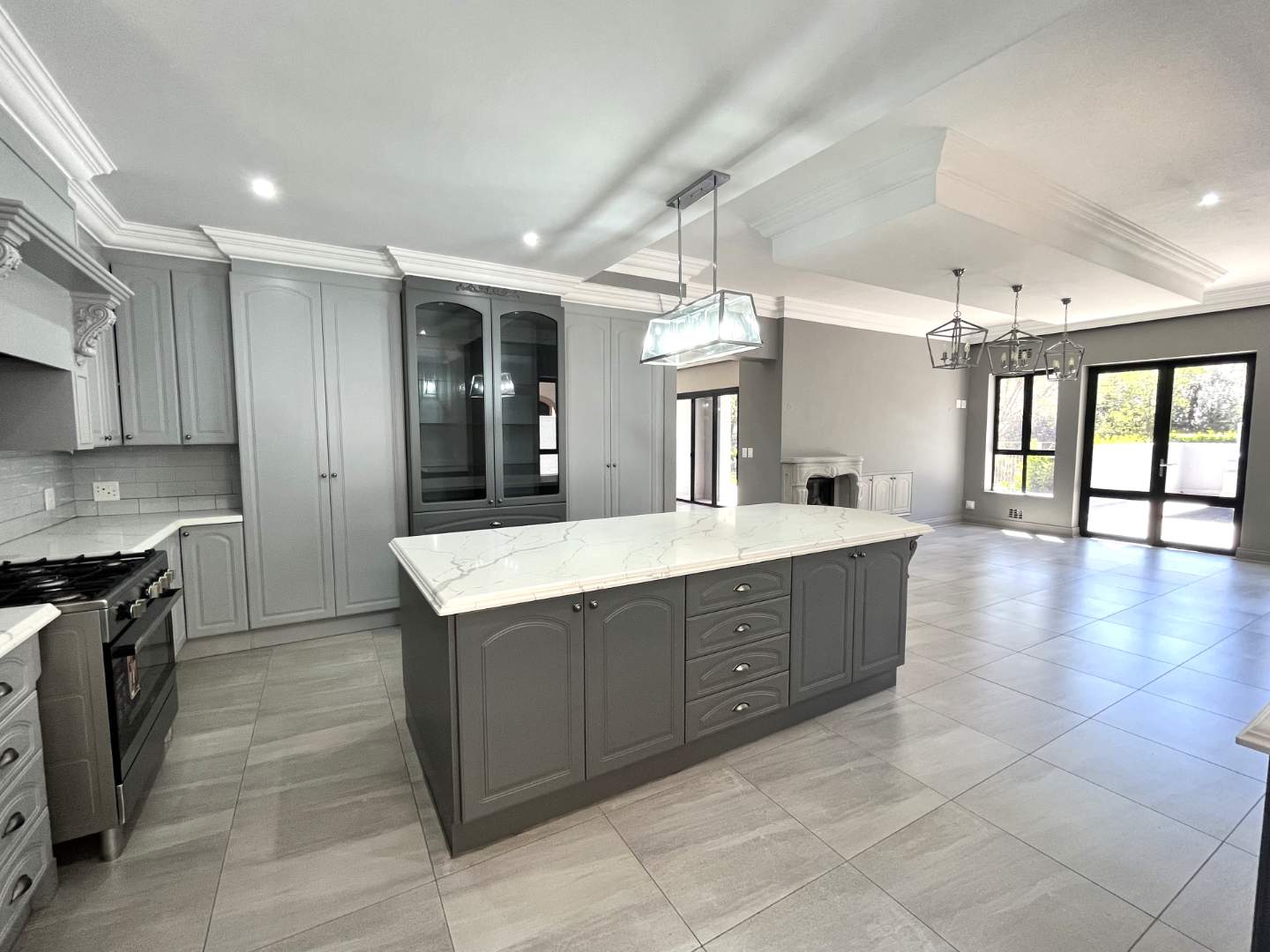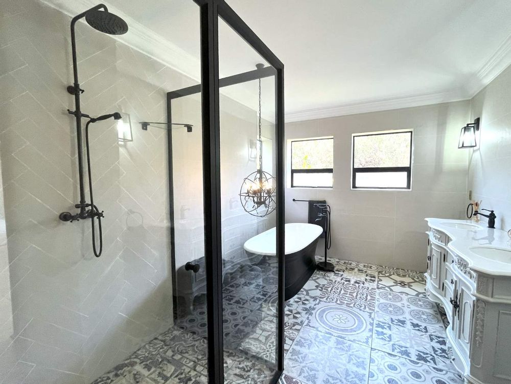 You are met with elegance and beautiful finishing on entering the home. Walking into an open plan living space with a fireplace and cozy separate tv room ,you overlook a beautiful garden and riverfront. You will feel right at home and at peace. The kitchen is well designed with an island and separate prep counter with prep bowl and with lots of cupboard space and a large pantry. The kitchen has a separate scullery from which the garages can be entered into. The dining room also has a fire place and overlooks the pool as it flows from the kitchen.