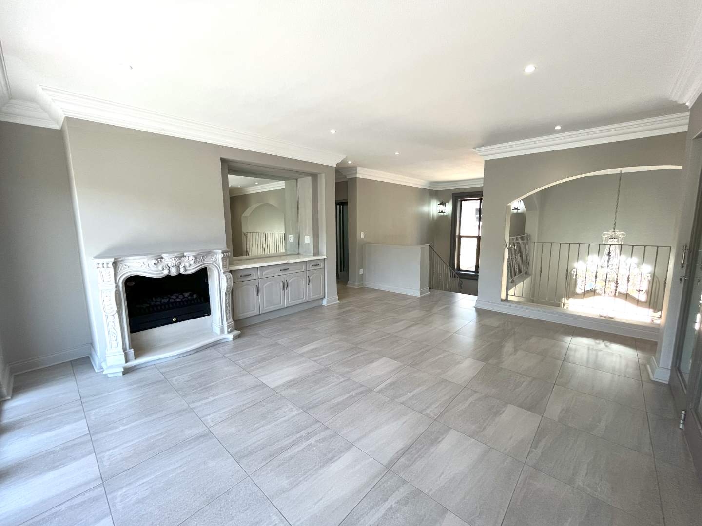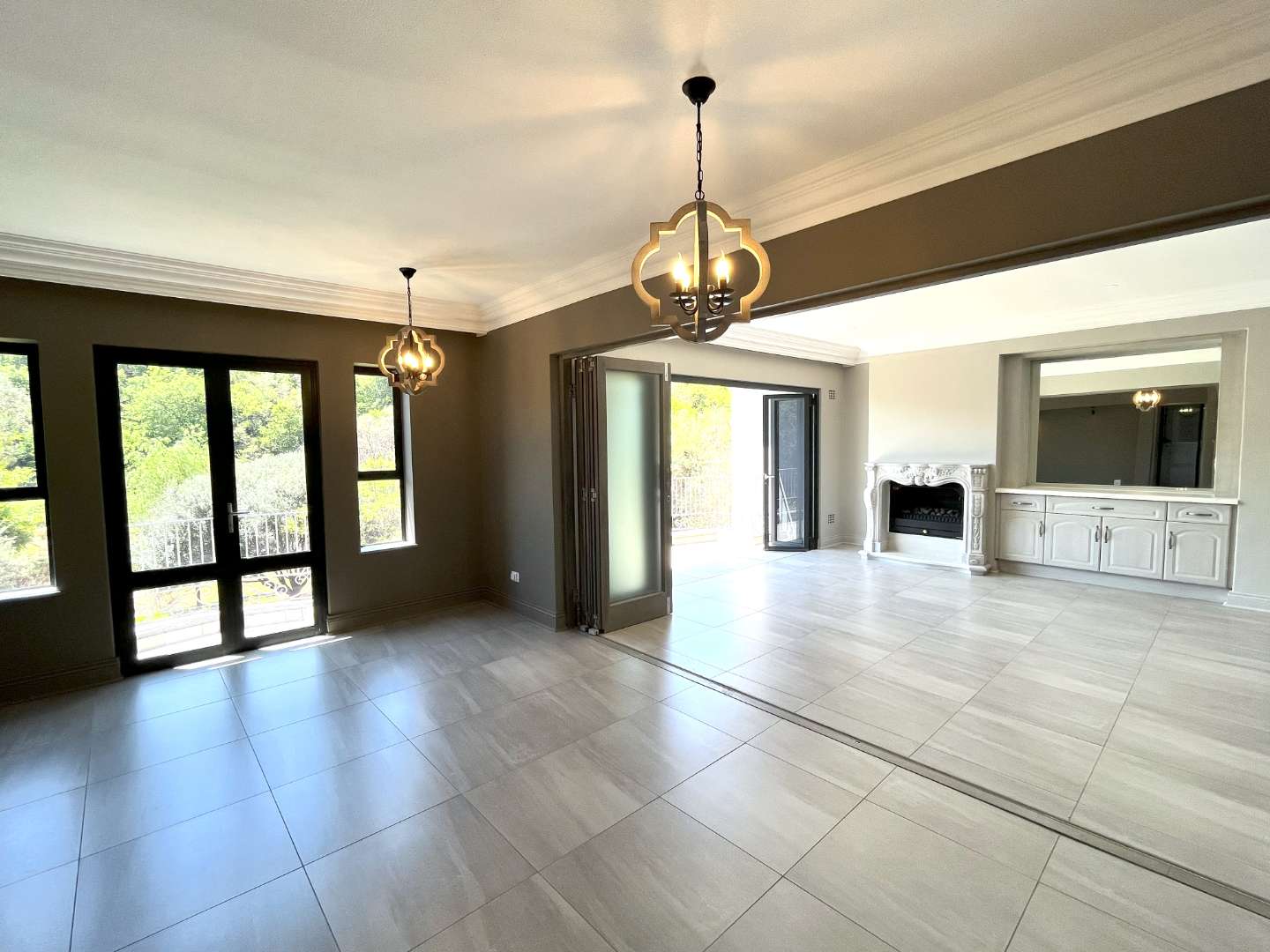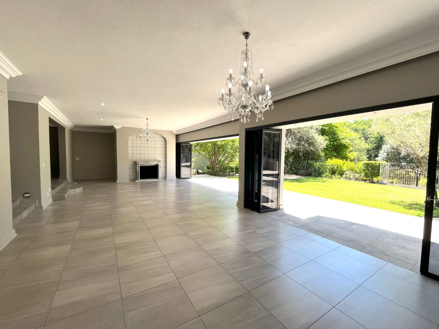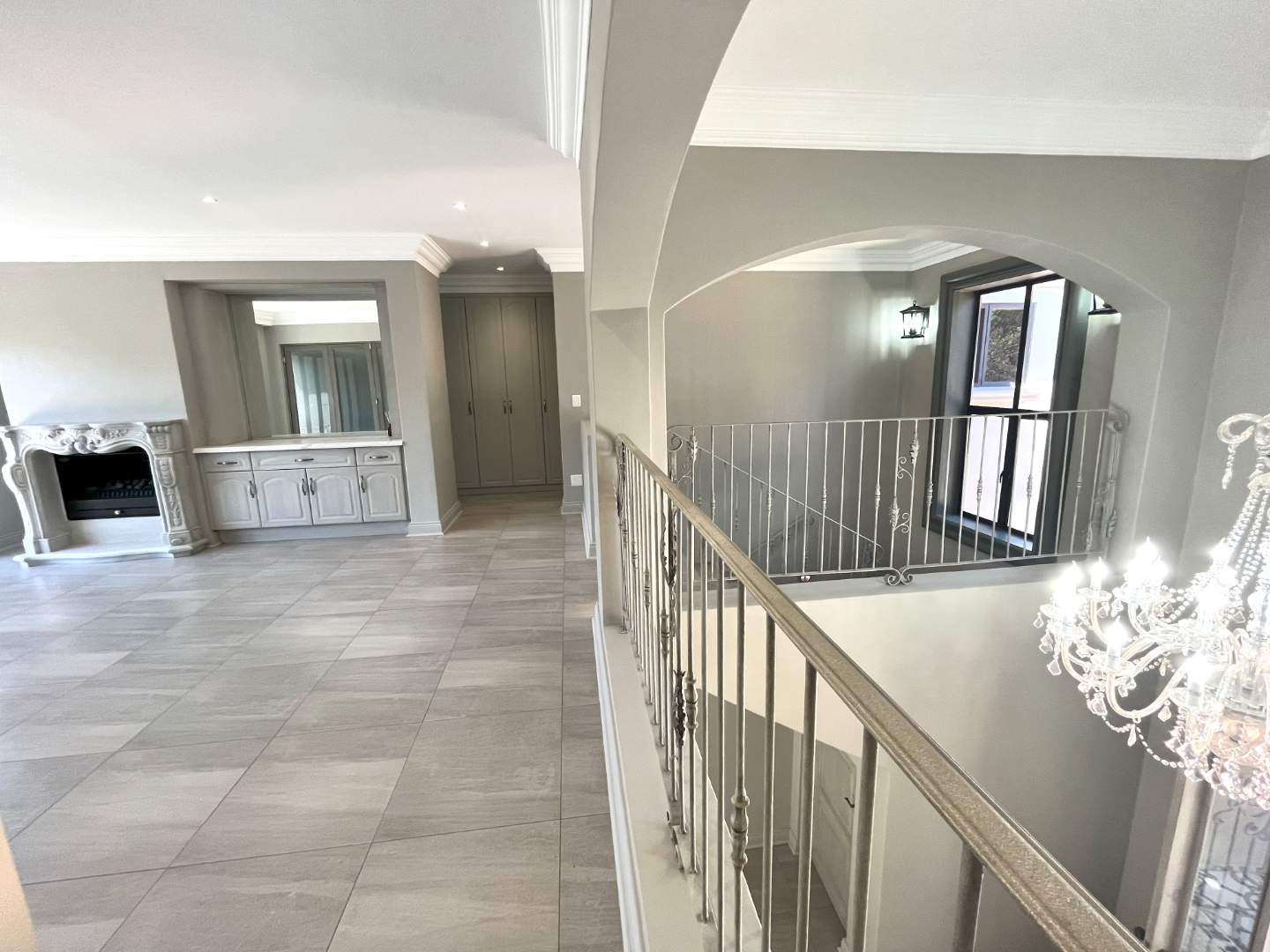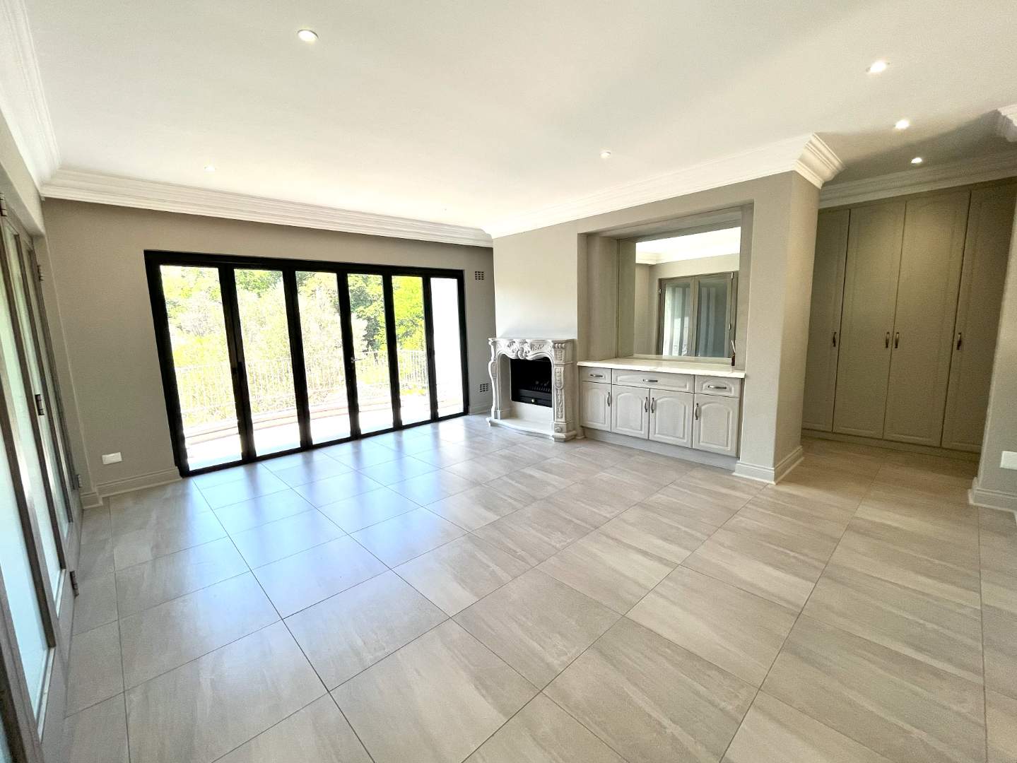 Upstairs are 4 bedrooms with their own en-suite bathrooms. Very modern, exquisite lighting with finishing touches to die for! The main bedroom opens up with stack doors onto the pajama lounge with a fire place. The balcony ensures a beautiful view with lots of fresh air on opening the doors.