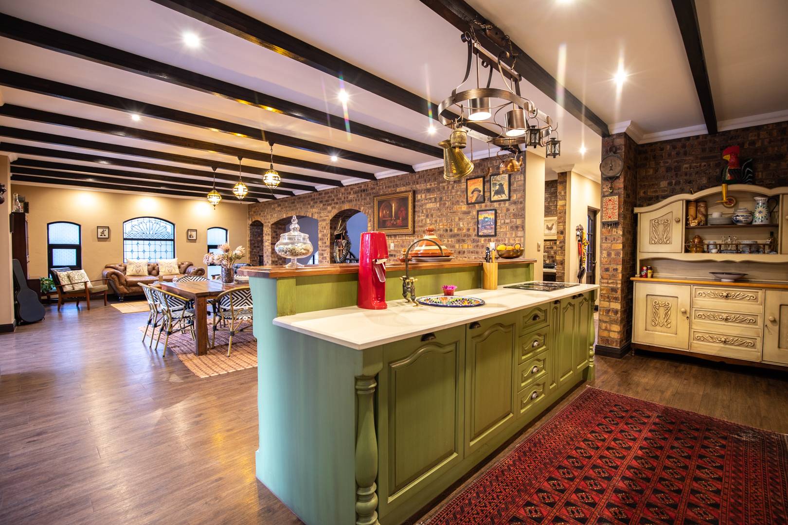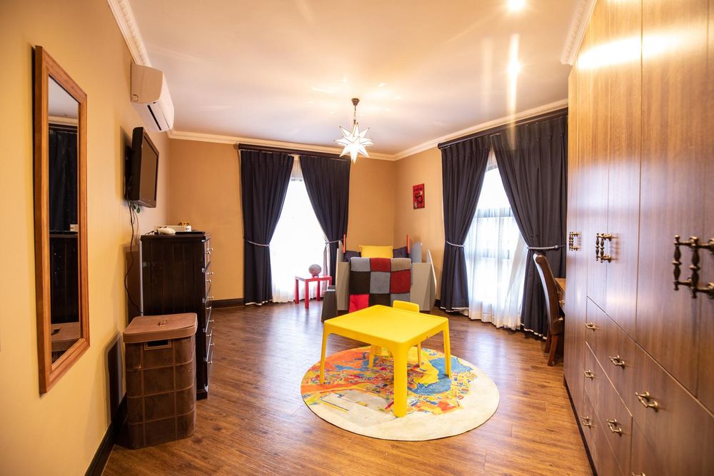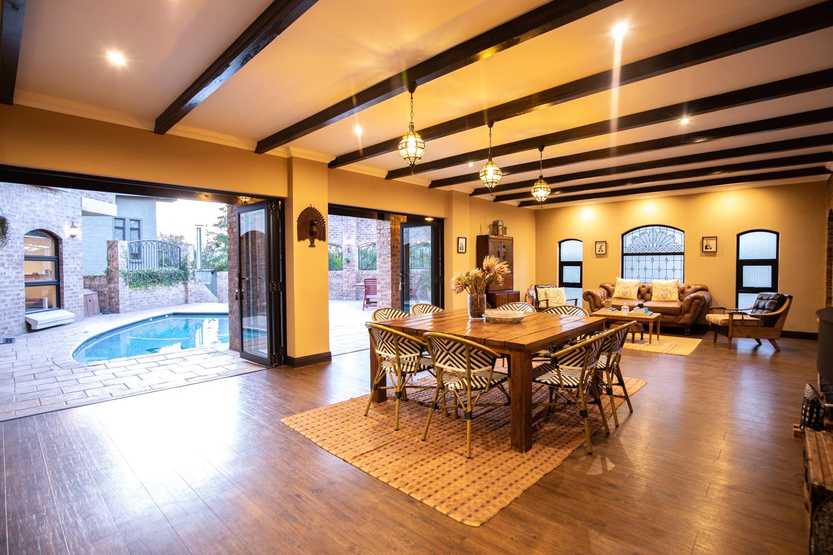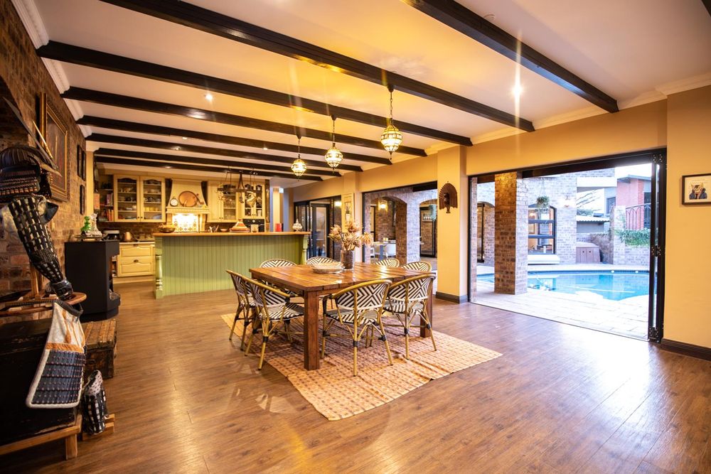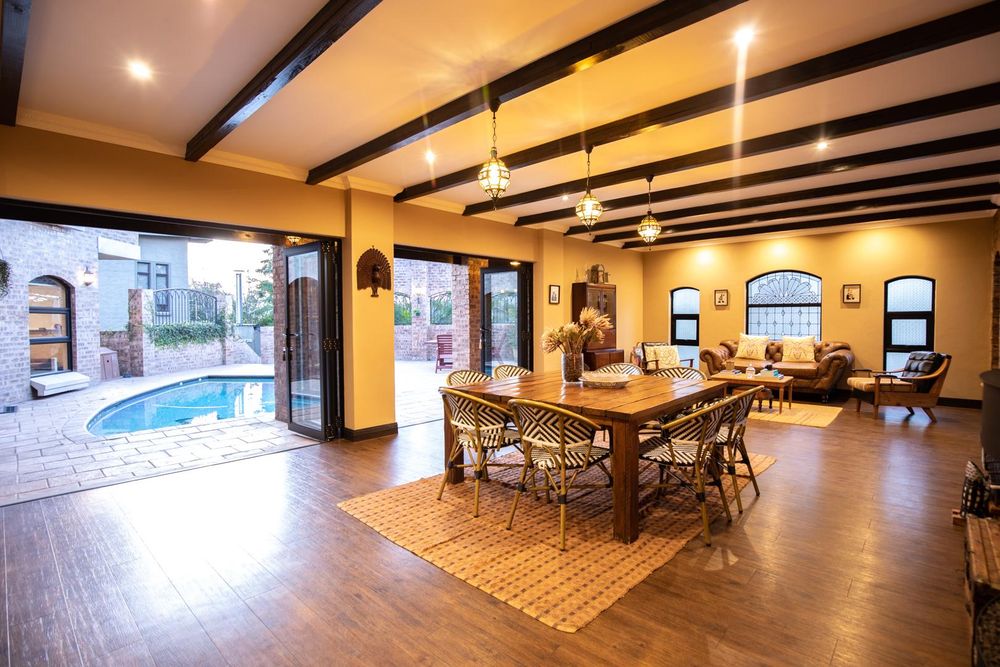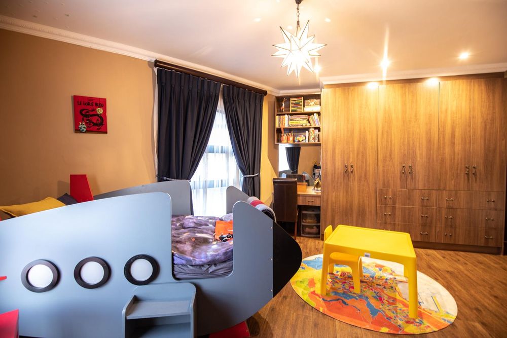 The entertainment areas are set on the second level, which also lead you to the heated pool and into the garden from both sides of the property, not to mention the double volume family room which is conveniently located next to the beautifully designed kitchen with a large walk-in pantry and scullery/laundry room. Prepare meals to your heart’s content on a gas hob, classic oven and two Snappy chefs, all set in ample Caesar stone and teak island.