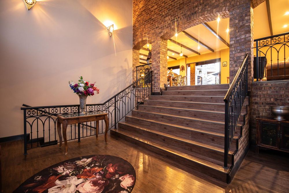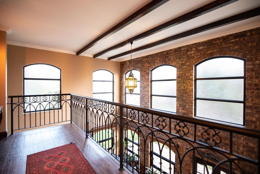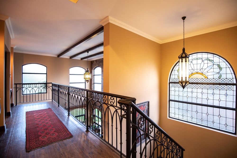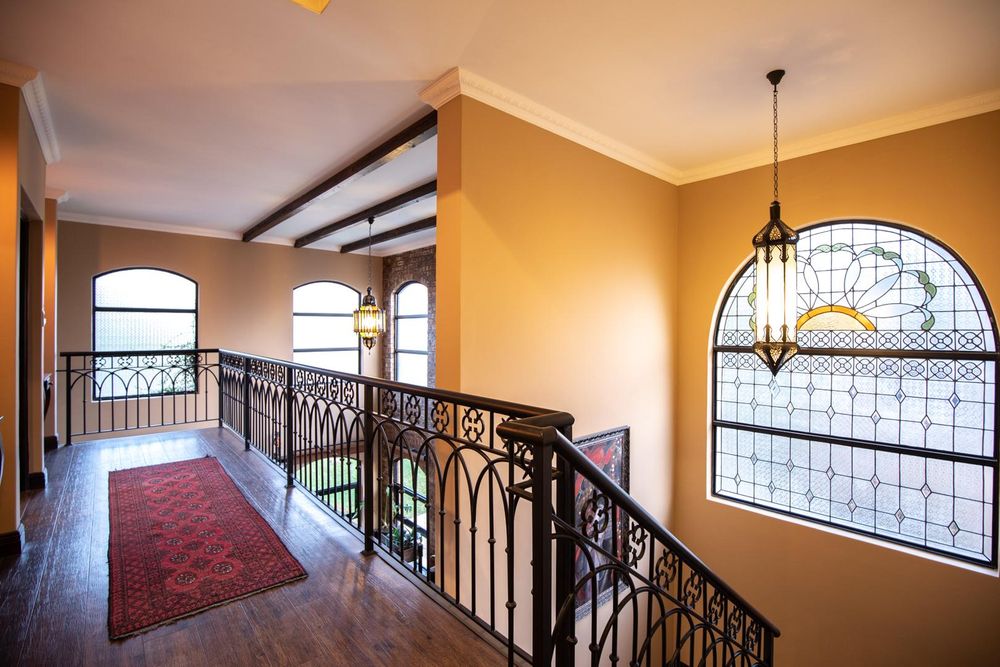 Stepping into the foyer evokes a sense of grandeur with rafter detail at 6 meters, hand-crafted stained-glass windows, custom metal work and a grand staircase that leads into the entertainment areas.