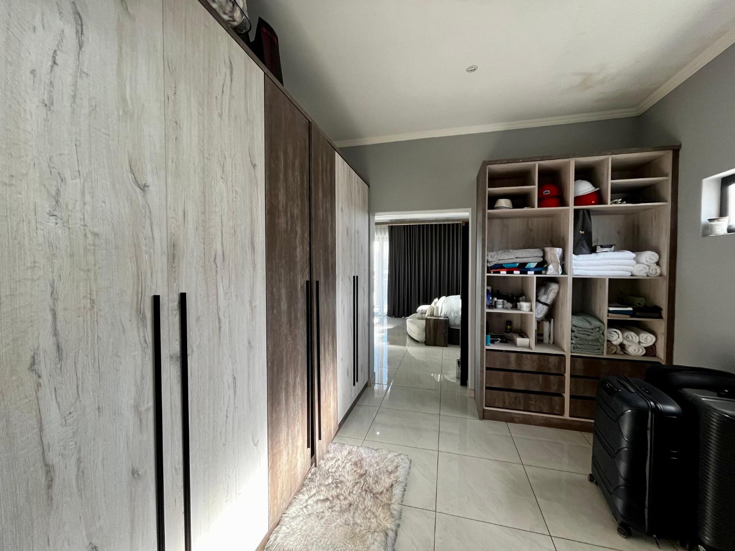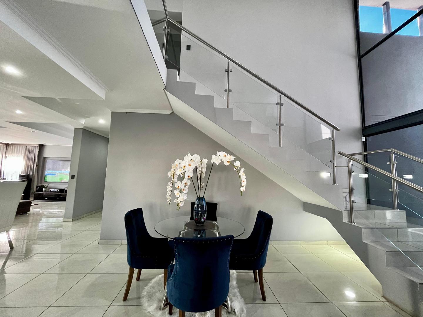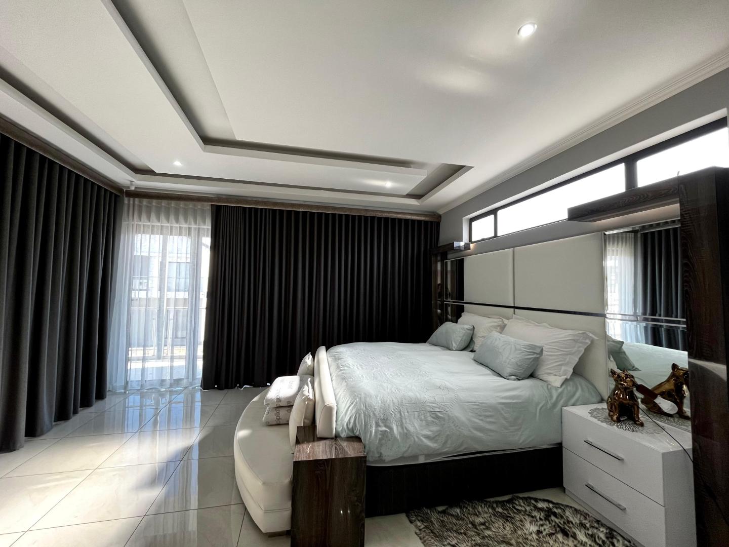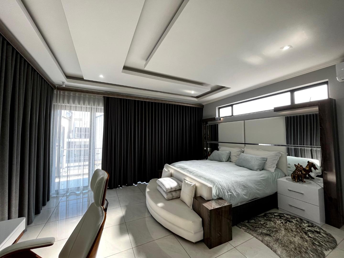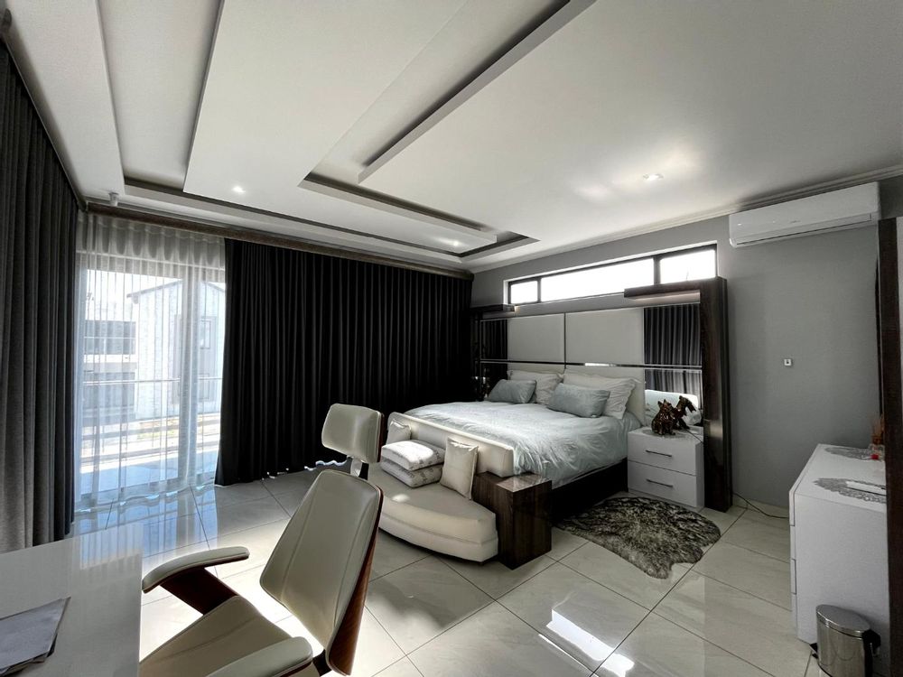 Upstairs, discover a generous pyjama lounge that flows seamlessly onto a balcony with captivating views of the garden below. The upper floor also houses a stunning main suite with access to the balcony, a fully equipped walk-in closet, and two additional spacious en-suite bedrooms.