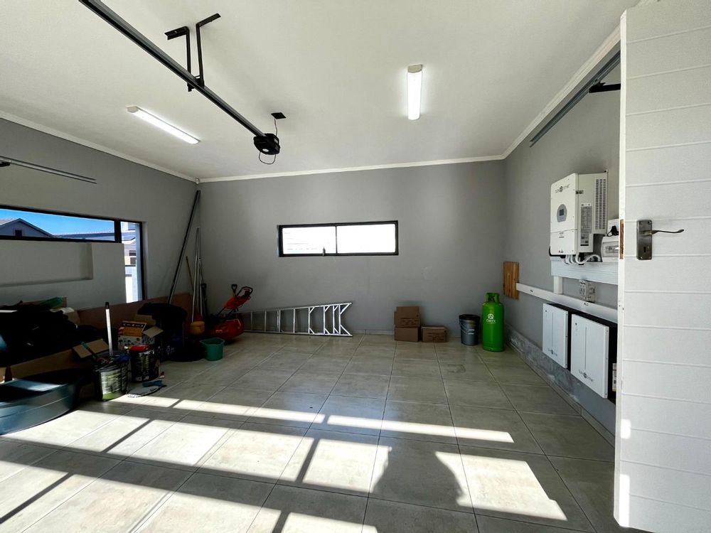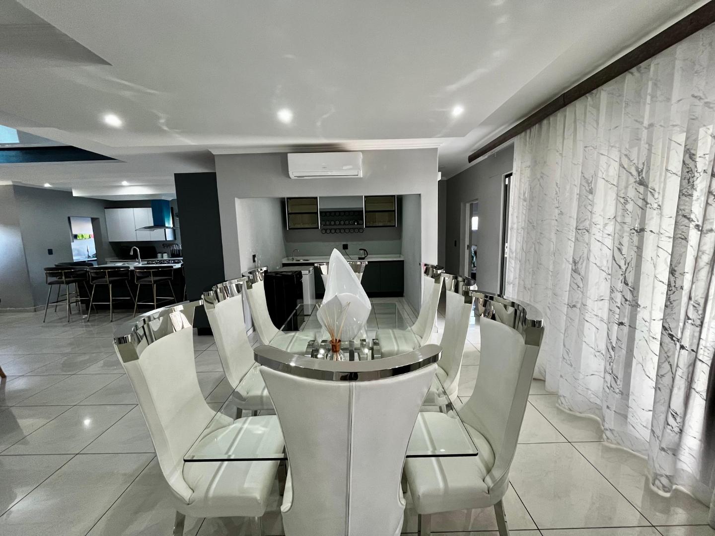 The open-plan living area is both spacious and inviting, featuring a luxurious living room and dining area with direct access to a covered patio. This outdoor space includes a built-in braai and overlooks an impressively landscaped garden. Enjoy cozy evenings around the fire pit or take a refreshing dip in the pool on warm days.